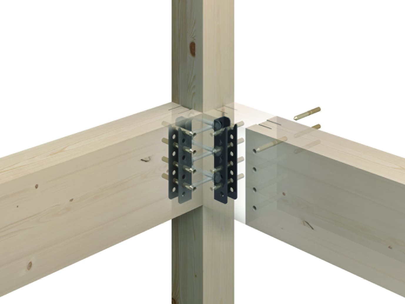 基本的にコネクタは木材の内部に隠れる仕組みになっています。従来の金物と異なり壁パネルを切り欠く必要がなく、建物の断熱性能を損なうこともありません。